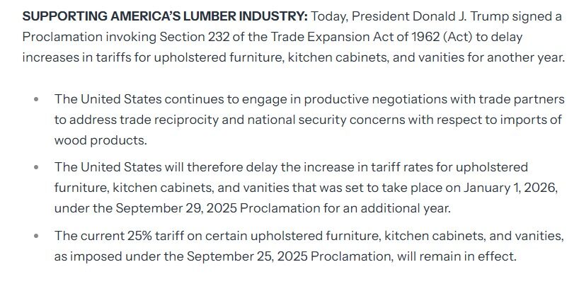 2025年12月31日,特朗普以一份签署文件向全世界宣布,将原本计划升级的软垫家具、橱柜及浴室柜关税,暂缓执行整整一年。但是,现行的25%税率保持不变。
